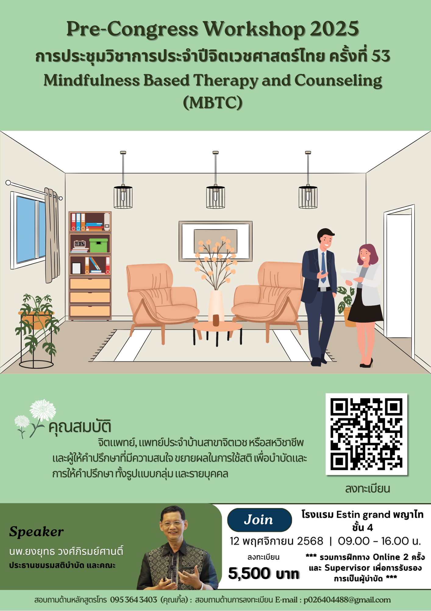 ขอเชิญผู้สนใจขยายผลในการใช้สติเพื่อบำบัดและการให้คำปรึกษาทั้งรูปแบบกลุ่มและรายบุคคล เข้าร่วมประชุม(Mindfulness-Based Therapy & Counseling: MBTC) ในงาน การประชุมวิชาการ Pre-Congress 2025