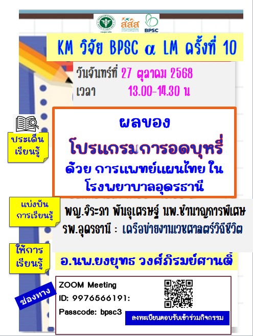 ขอเรียนเชิญเชิญลงทะเบียนเข้าร่วมกิจกรรมเรียนรู้ KM วิจัย BPSC & LM ครั้งที่ 10