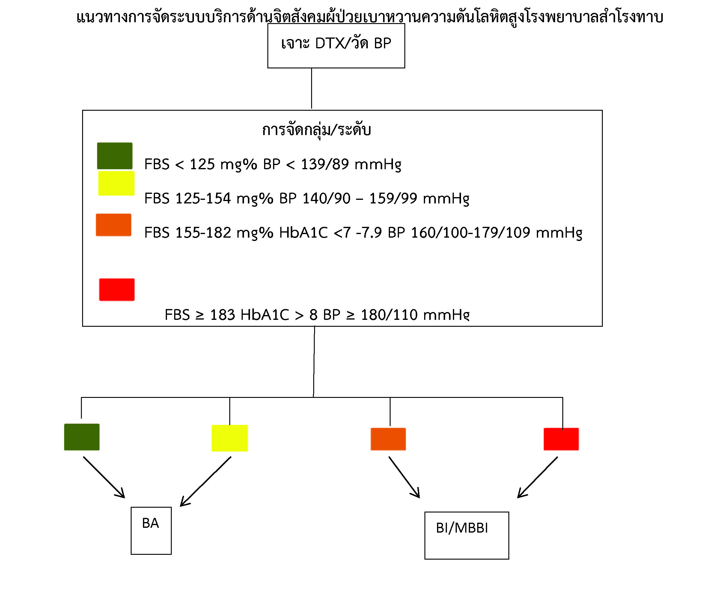 เนื่องจากระบบบริการมีผู้ป่วยNCDs จํานวนมากขึ้น เพื่อปรับปรุงกระบวนการการดูแลผู้ป่วยเบาหวานความดันโลหิตสูงอย่างเป็นระบบและต่อเนื่อง โรงพยาบาลสำโรงทาบได้นําเครื่องมือสําคัญคือการแนะนําแบบสั้น (Brief advice : BA) มาใช้กับ ผู้ป่วยส่วนใหญ่ให้เกิดแรงจูงใจในการปรับเปลี่ยนพฤติกรรมเสี่ยง การให้คําปรึกษาแบบสั้น (Brief intervention : BI) สําหรับ ผู้ป่วยที่มีพฤติกรรมเสี่ยงจนป่วยโดยเฉพาะผู้ป่วยNCDs ในการปรับเปลี่ยนพฤติกรรมเสี่ยงโดยเฉพาะเรื่องอาหาร ออกกําลังกายและอารมณ์เครียดของผู้ป่วยNCDs การให้คําปรึกษาแบบสั้นที่เน้นการค้นหาและช่วยเหลือแก้ไขพฤติกรรมเสี่ยงจะมีประสิทธิผลมากขึ้นหากใช้การฝึกสมาธิและสติเขาไปเป็นส่วนหนึ่งของการให้คําปรึกษาจะช่วยให้ผู้ป่วยปรับเปลี่ยนพฤติกรรมเสี่ยงได้ดีขึ้น เพราะมี self efficacy สูงคือผู้ป่วยทําเองและได้ผลเอง ในคลินิกการให้บริการ NCDs โรงพยาบาลสำโรงทาบ กลุ่มผู้ป่วยโรคเบาหวานที่ควบคุมน้ำตาลได้ไม่ดีและกลุ่มผู้ป่วยโรคความดันโลหิตสูงใน กลุ่มสีส้ม สีแดง ได้มีการปรับระบบบริการให้นํา MBBI ที่มีการฝึก 3-4 ครั้ง เข้าไปเป็นส่วนหนึ่งของบริการใน NCDs คลินิกกําหนดเป็นกิจกรรมป่วยที่มีข้อบ่งชี้ฝึกทําระหว่างรอคอยแพทย์ในครั้งที่ 1 และนัดทุกสัปดาห์มาทําโดยไม่ต้องมาคอยยื่นบัตรหรือพบแพทย์อีกครั้ง ส่วนครั้งที่ 4 ก็เป็นนัดหมายตามปกติ ในปี 2564-2565 เนื่องจากมีสถานการณ์โรคโควิด-19 ระบาด จึงได้นัดเฉพาะผู้ป่วยโรคเบาหวานกลุ่มสีส้มและสีแดง มาทำ MBBI