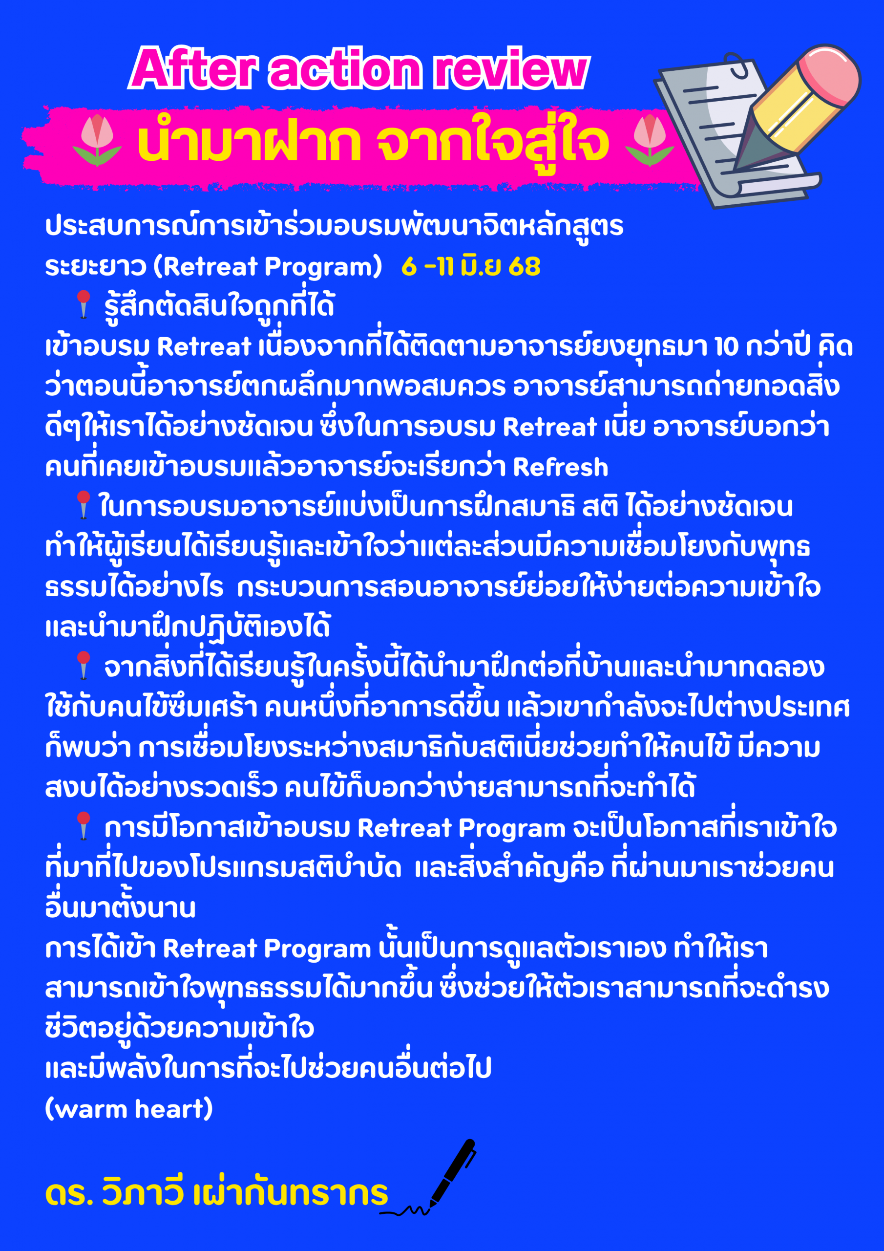 บรรยากาศภายในกิจกรรมเป็นไปอย่างสงบและอบอุ่น ผู้เข้าร่วมต่างได้รับความรู้และประสบการณ์ตรงในการฝึกปฏิบัติอย่างต่อเนื่องตลอดระยะเวลา 6 วัน พร้อมทั้งสามารถนำไปประยุกต์ใช้ในชีวิตและการทำงานได้จริง
