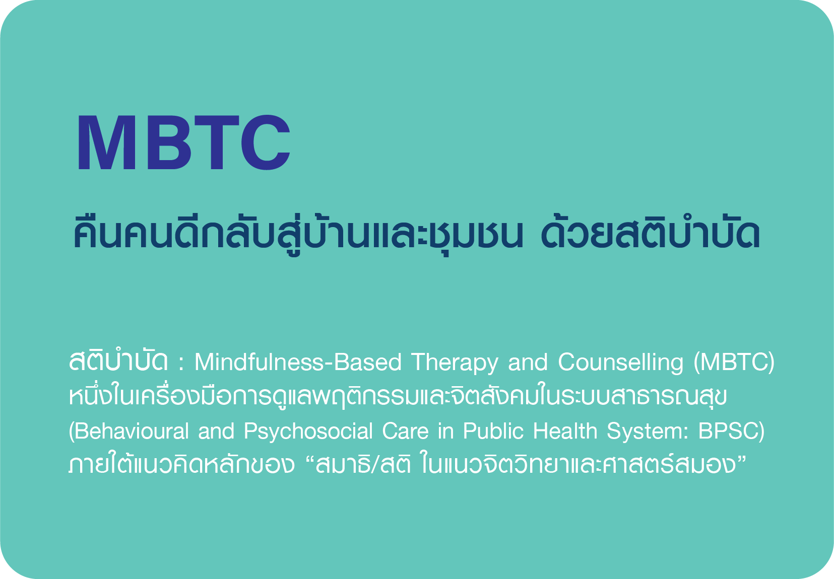 สติบำบัด หรือ Mindfulness-Based Therapy and Counselling (MBTC) ภายใต้แนวคิดหลักของ “สมาธิ/สติ ในแนวจิตวิทยาและศาสตร์สมอง” เป็นเครื่องมือหนึ่งของการดูแลพฤติกรรมและจิตสังคมในระบบสาธารณสุข (Behavioural and Psychosocial Care in Public Health System: BPSC) และได้ถูกนำมาใช้เชื่อมโยงกับการดูแลผู้ป่วยที่มีอาการรุนแรง อยู่ในขั้นเลวร้ายและมีภาวะแทรกซ่อน รวมถึงมีโรคร่วมทางด้านจิตเวช (comorbidity) โดยเฉพาะโรคซึมเศร้า วิตกกังวล ติดสุรา/สารเสพติด ตลอดไปจนถึงผู้ป่วยที่มีปัญหาทางกายภาพ เช่น ผู้ป่วยกลุ่ม NCDs ที่มีภาวะแทรกซ้อนรุนแรง เพื่อการป้องกันแบบเฉพาะเจาะจง