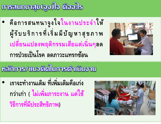 2. พัฒนาศักยภาพบุคลากรให้สามารถนำการดูแลพฤติกรรมและจิตสังคมในระบบสาธารณสุขมาใช้ในการพัฒนาพฤติกรรมการให้บริการ และพัฒนาการให้บริการทางการแพทย์ทุกขั้นตอน ตั้งแต่จุดแรกรับจนผู้ป่วยได้รับยากลับบ้านสำหรับผู้ป่วยนอก หรือเข้ารับไว้รักษาในโรงพยาบาลสำหรับผู้ป่วยใน