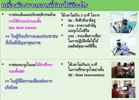 – เจ้าหน้าที่หน้างานจะให้บริการ BA ประมาณ 3 นาที แก่กลุ่มเป้าหมาย เพื่อสร้างแรงจูงใจในการปรับเปลี่ยนพฤติกรรมสุขภาพ