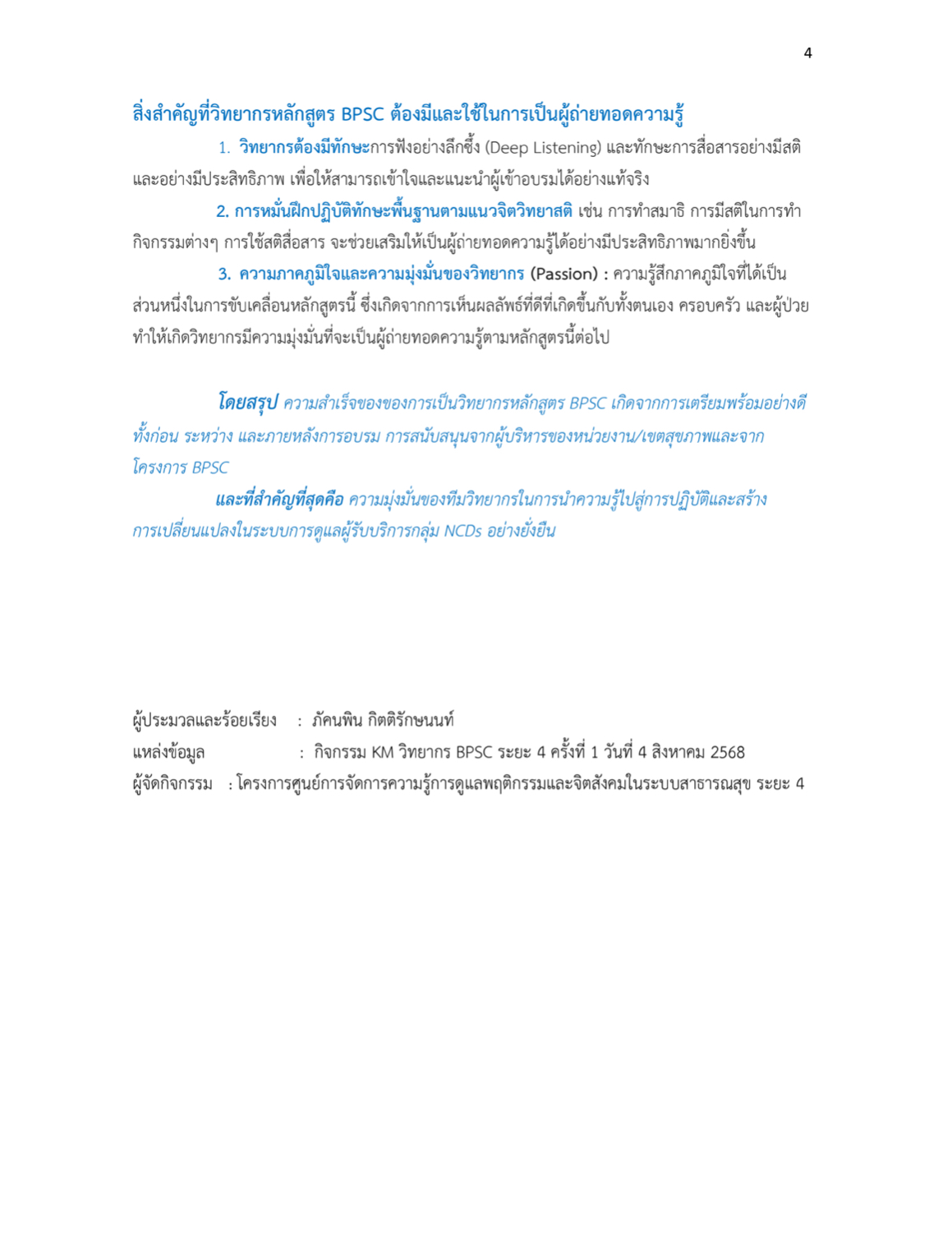 การเป็นวิทยากรไม่เพียงแต่ต้องมีความรู้ความสามารถเชิงวิชาการ หากแต่ยังต้องมีทักษะการถ่ายทอด การสื่อสาร และการสร้างแรงบันดาลใจให้แก่ผู้เข้าร่วมอบรม บทความนี้จึงมุ่งนำเสนอแนวคิด “กุญแจสำคัญสู่ความสำเร็จการเป็นวิทยากรหลักสูตร BPSC” ที่สรุปจากประสบการณ์ตรงและการแลกเปลี่ยนเรียนรู้ภายในกิจกรรม KM เพื่อเป็นแนวทางสำหรับผู้ที่ต้องการพัฒนาตนเองสู่การเป็นวิทยากรมืออาชีพอย่างมีคุณภาพและยั่งยืน