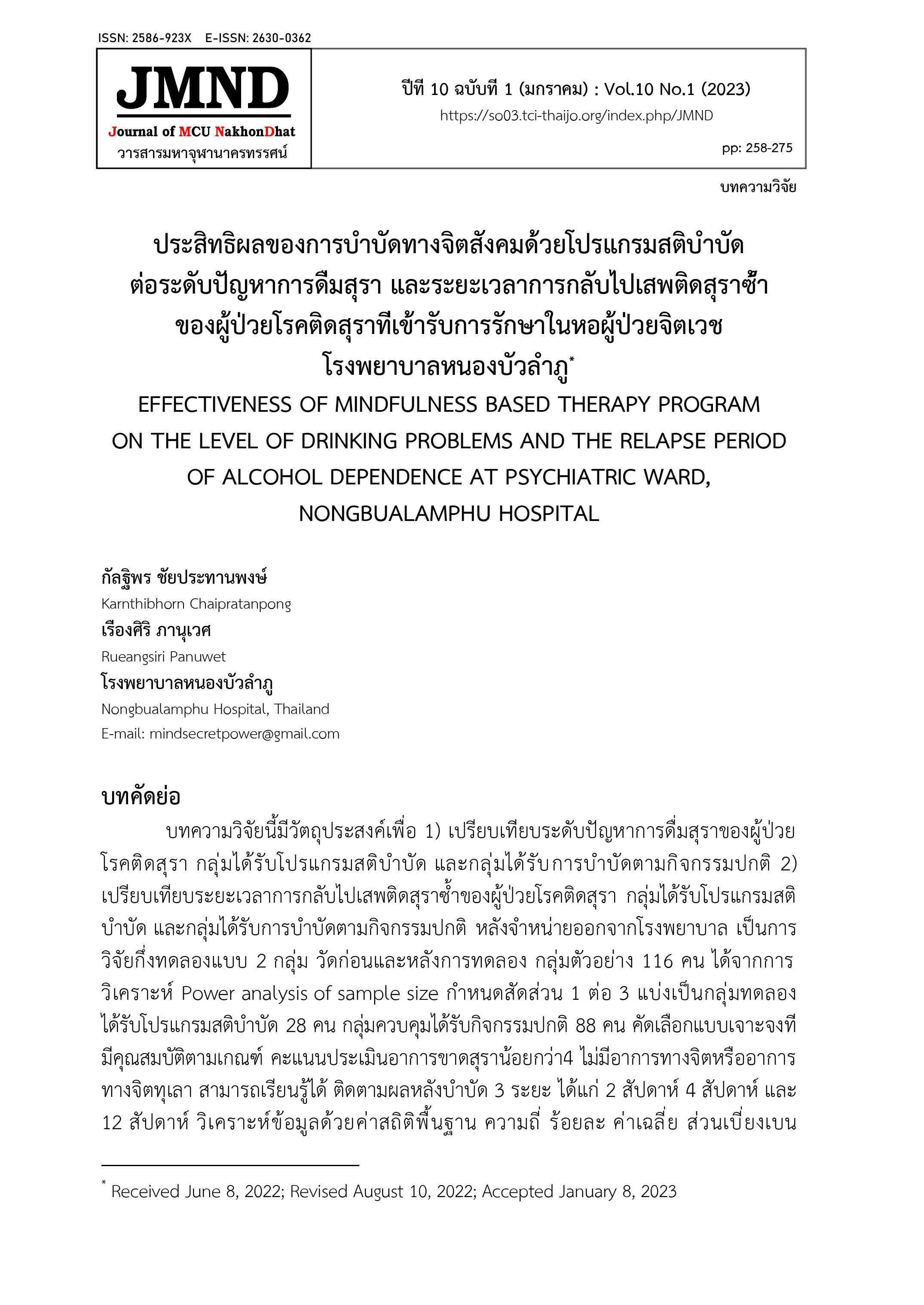 ประสิทธิผลของการบำบัดทางจิตสังคมด้วย MBTC (ดาวน์โหลดเอกสารที่นี่)