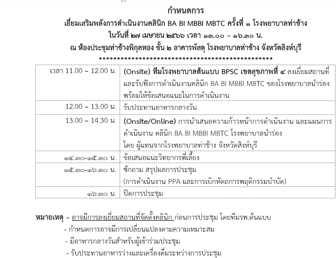 วันที่ 26 เมษายน 2566 เวลา 13.00 – 16.30 น. รพ. พระนารายณ์มหาราชเเยี่ยมเสริมพลังการดำเนินงานคลินิก BA, BI, MBBI, MBTC ครั้งที่ 1 โรงพยาบาลท่าช้าง จ.สิงห์บุรี ณ ห้องประชุมท่าช้าง พิกุลทอง โรงพยาบาลท่าช้าง จังหวัดสิงห์บุรี