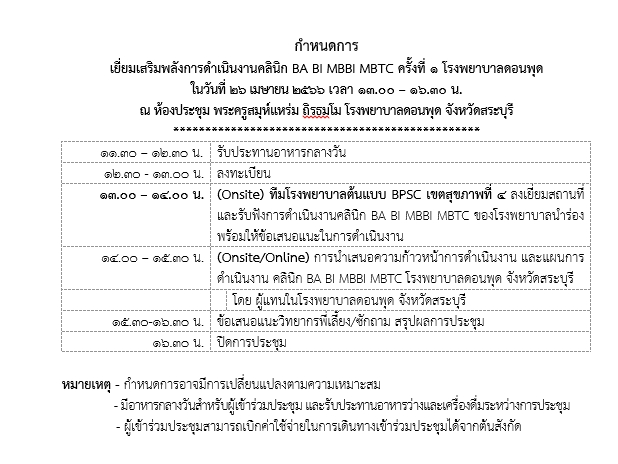 วันที่ 26 เมษายน 2566 เวลา 13.00 – 16.30 น. รพ. พระนารายณ์เเยี่ยมเสริมพลังการดำเนินงานคลินิก BA BI MBBI MBTC